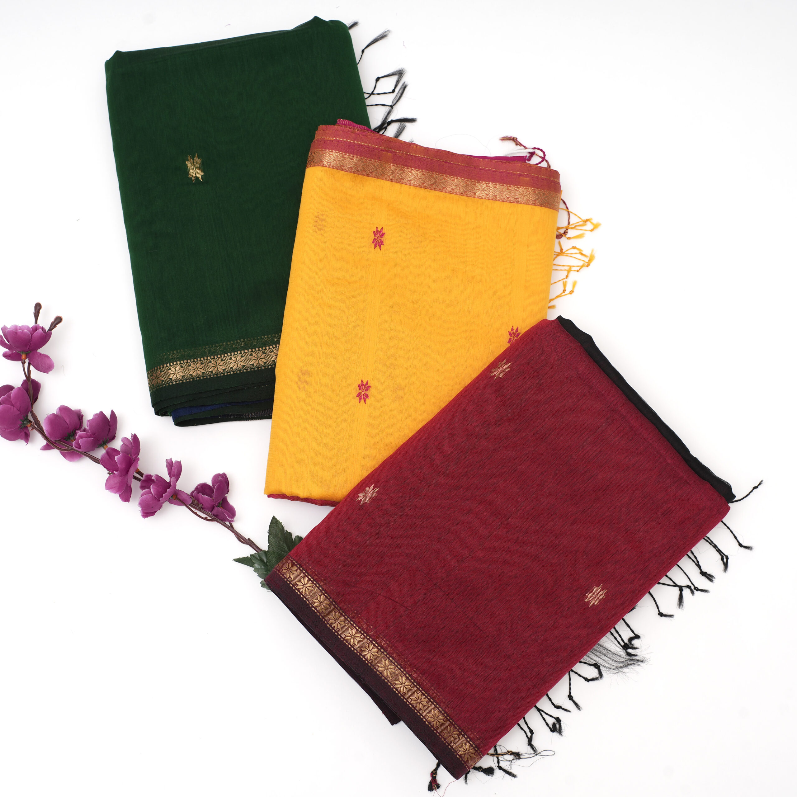 Silk- Cotton Saree, meticulously crafted with 80% pure silk and 20% fine cotton threads. This exquisite blend of fabrics offers a luxurious drape with a soft comfortable feel, perfect for any occasion.