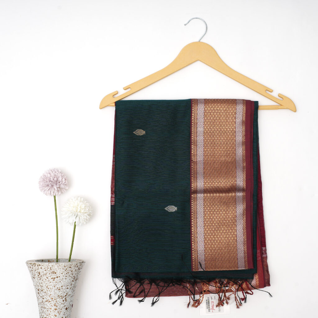 Silk- Cotton Saree, meticulously crafted with 80% pure silk and 20% fine cotton threads. This exquisite blend of fabrics offers a luxurious drape with a soft comfortable feel, perfect for any occasion.
